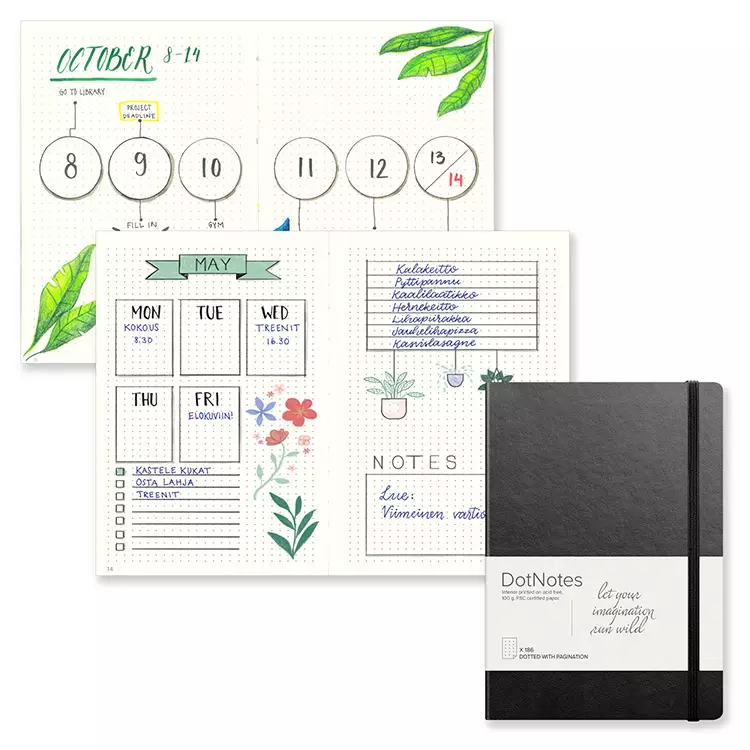 Burde DotNotes -muistikirjassa on pehmeät keinonahkakannet, tyylikkään kermanväriset sivut ja kuminauhasuljenta. Numeroidut pistesivut (1-186) soveltuvat niin tehtävälistojen tekemiseen, muistiinpanojen kirjoittamiseen kuin vaikka piirtämiseen ja luonnosteluunkin. Sisältösivu toimii hakemistona. Kirjan sivut on valmistettu FSC-sertifioidusta puuaineksesta ja paperi on happovapaata. Väri: musta. Mitat: A5. Sivumäärä: 192. Paperin paino: 100 G.