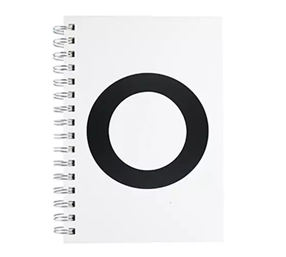 Burde O -muistikirjassa on valkoinen kartonkikansi mustalla symbolilla. Parikierresidotun kirjan sivut ovat blankot.