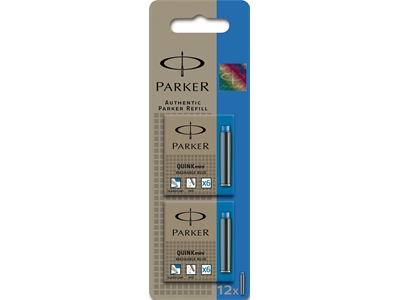 Pienikokoinen mustepatruuna Parker-mustekynääsi. Runsaspigmenttinen Quink-muste virtaa sujuvasti, kuivuu nopeasti ja jättää vahvan jäljen. Muste on vesiliukoista. Musteen väri: sininen Blisterpakkauksessa on 12 vaihtosäiliötä.