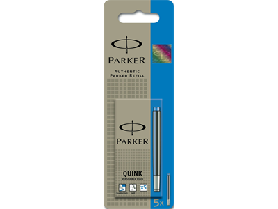 Mustepatruuna Parker-mustekynääsi. Runsaspigmenttinen Quink-muste virtaa sujuvasti, kuivuu nopeasti ja jättää vahvan jäljen. Pysyvä muste on arkistokelpoista. Musteen väri: sininen Blisterpakkauksessa on viisi vaihtosäiliötä.