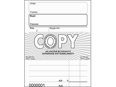 Jäljentävää paperia. Perforoitu. Laskelma. Numeroitu. 1+1 kopiota. 100 lehteä. Viivaus, suomi/ruotsi. Yhteenveto takakannessa. Kansi toimii välipahvina.