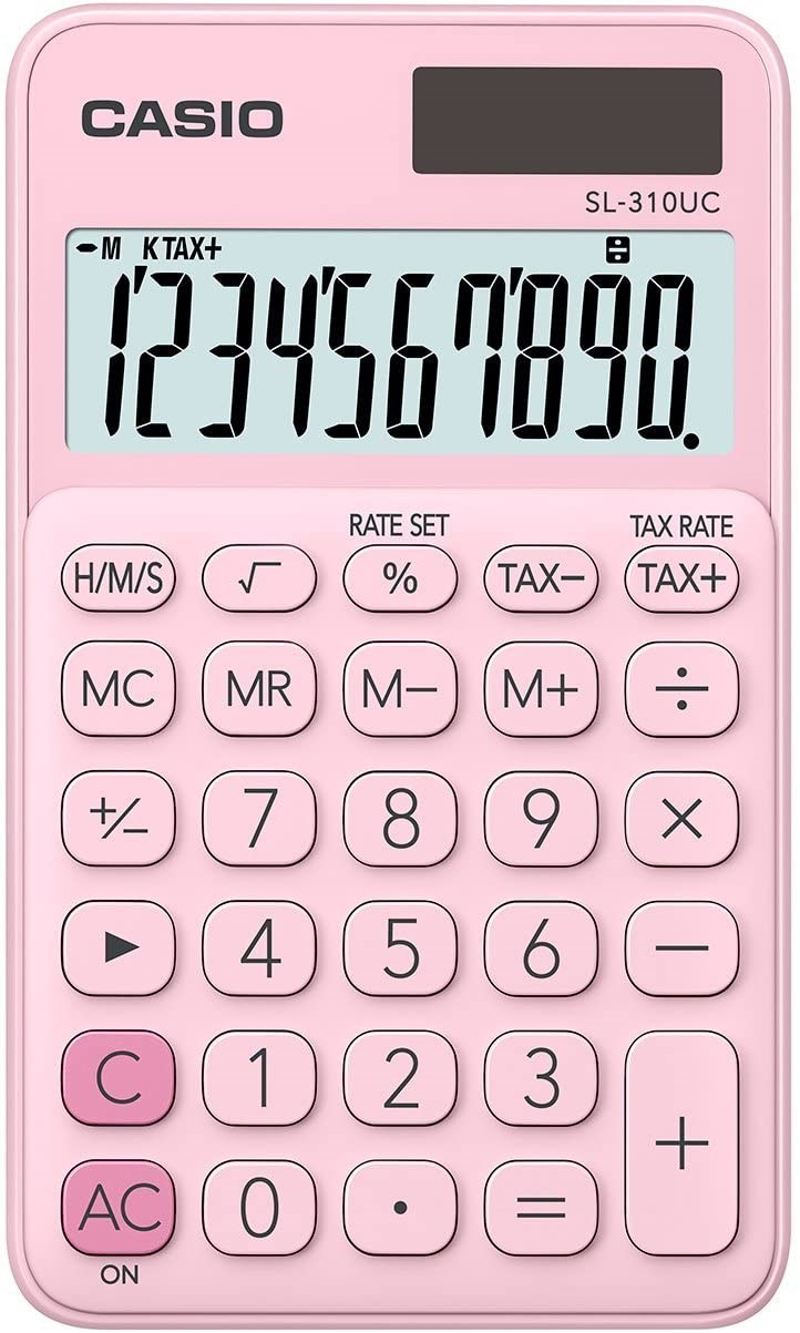 Casio laskin SL-310UC, vaaleanpunainen. Yleiset tiedot 10-numeroinen BIG-näyttö toimintojen komentomerkeillä Kaksisuuntainen teho Mitat (K x L x P): 0,8 x 7 x 11,8 cm Muoviset avaimet Avaimen kierto Paino: n. 50 g Toiminnot Ammattimainen prosenttilaskenta Voittomarginaali %-näppäimellä Aikalaskenta VERON laskenta 4-näppäimen muisti 3-numeroiset pilkkumerkit Avain plus-/miinusmerkin vaihtamiseen Askelpalautin Neliöjuuri