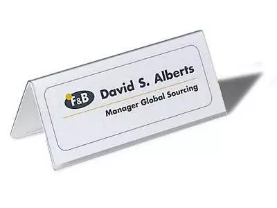 Nimikyltti pöydälle 61/122x150mm Luettavissa molemmilta puolilta. Mukana vaihdettavat kartonkiset kortit, joissa reunakoriste.