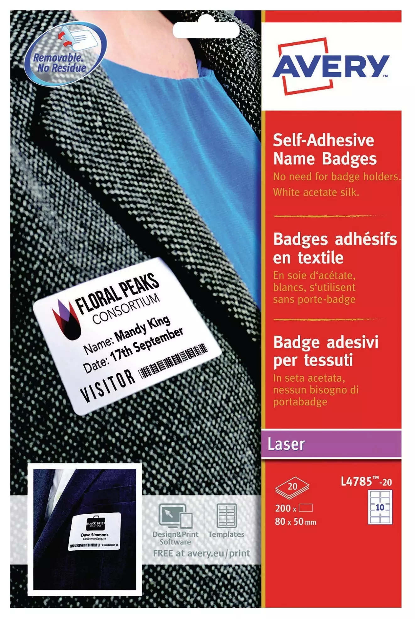 Avery L4785 on itseliimautuva vaatetarra, joka soveltuu käsinkirjoitukseen ja lasertulostukseen. Tarran materiaali on PVC-vapaata kangasta, joka takaa kiiltävän lopputuloksen. Joustavat ja kestävät tarrat on helppo irrottaa taustapaperista. Ei sovellu herkille tekstiileille (esim. nahka ja silkki).