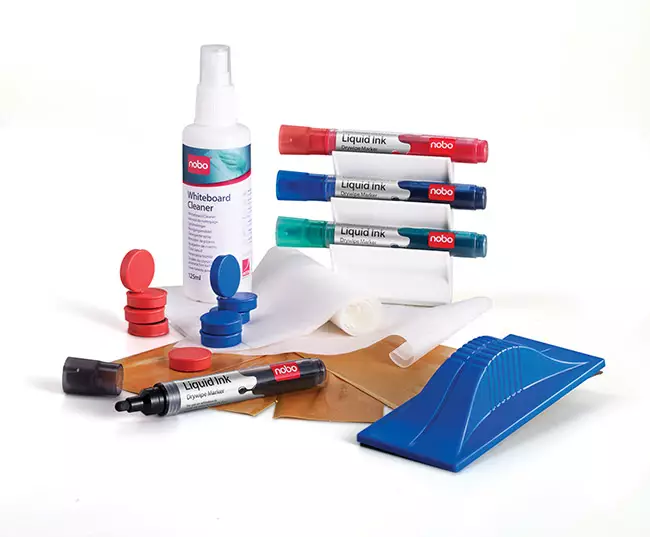 Kaikki mitä tarvitset valkotaulun tehokkaaseen käyttöön. Paketti sisältää magneettisen kynätelineen ja 4 pyyhittävää kynää, magneettisen pyyhkimen ja 5 vaihtopintaa, puhdistusainespray 125 ml ja liiina sekä 5 kpl punaista ja 5 kpl sinistä pyöreää 25 mm magneettia.