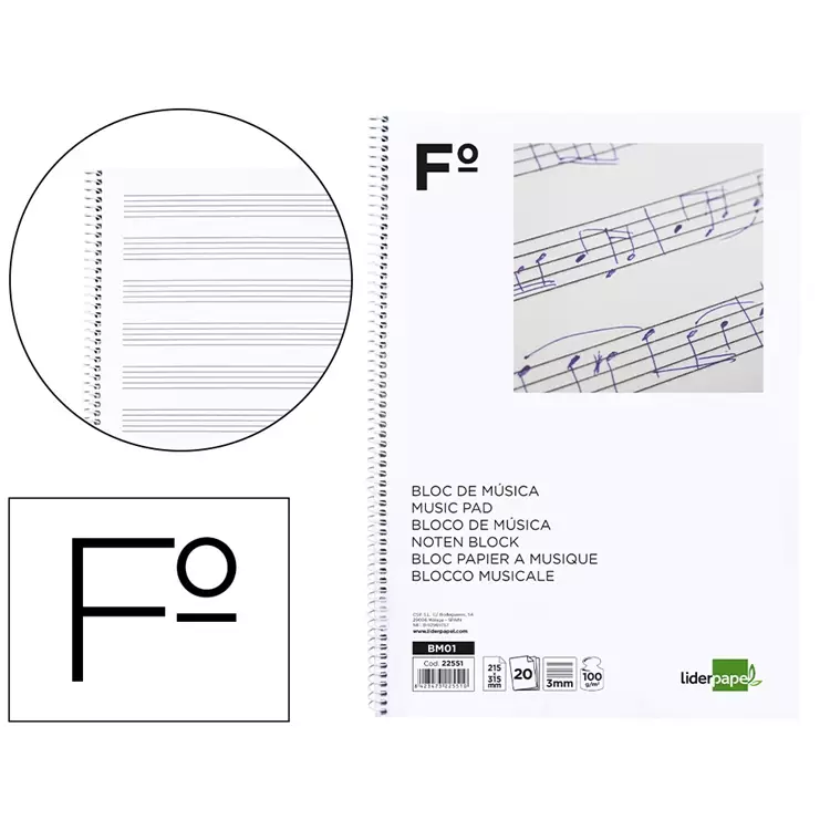 Liderpapelin nuottivihkossa on kierresidonta ja 12 viivastoa jokaisella kestävästä paperista valmistetulla sivulla. Viivaston riviväli on 3 mm. Mitat: A4+ (215 x 315 mm) Sivumäärä: 20 lehteä Paperin paino: 100 g