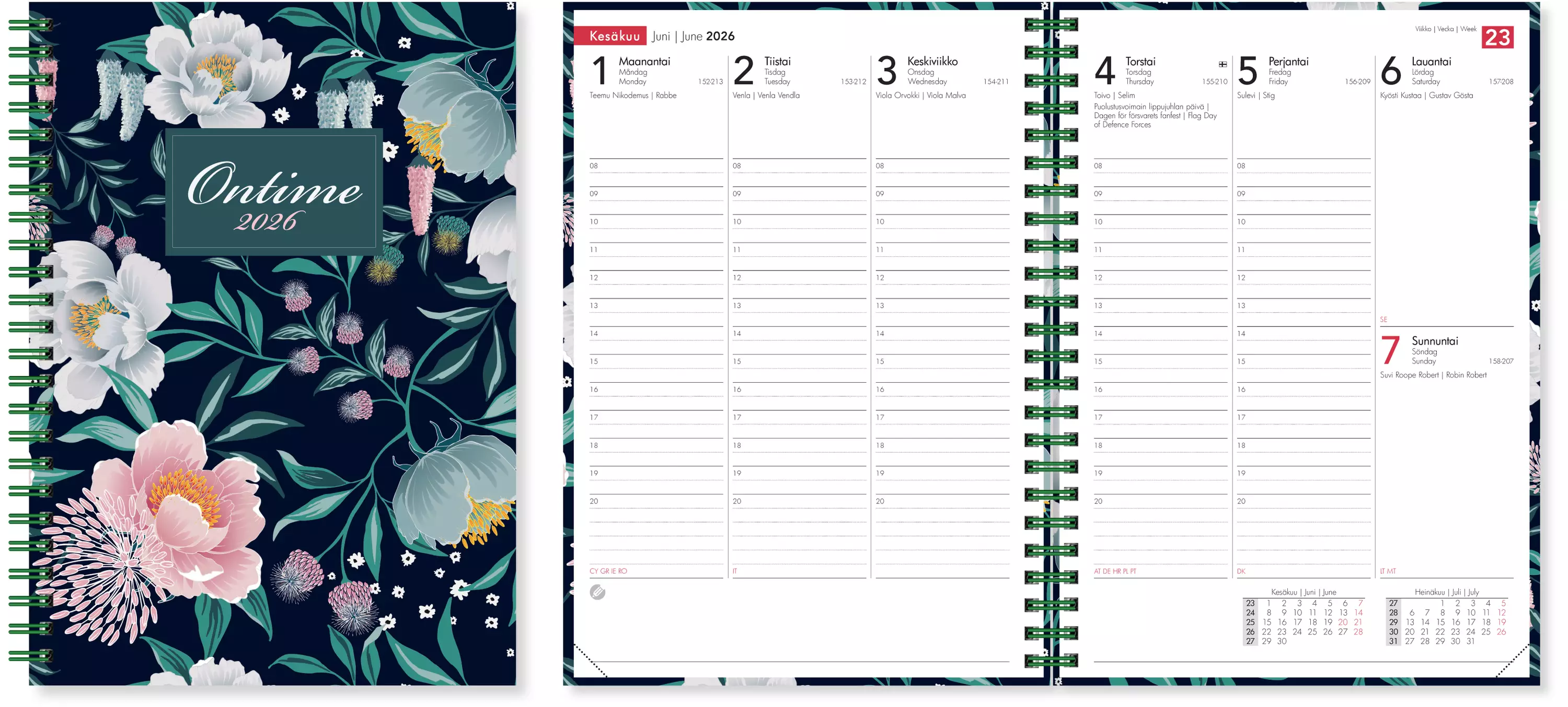 Kalenterin koko on A5, viikot 50/2025-1/2027, aukeamalla viikko, tunnit 8-20. Vuosisuunnittelu 2026 ja vuosi 2027 laajennettuna, liputuspäivät, nimipäivät ja päiväkohtaista muistiinpanotilaa. Kansalliset pyhät aukeamilla ja luettelona. Wiresidottu, kulmaperforoitu. Kaunis kirjakansi. Kielisasu suomi, ruotsi ja englanti.