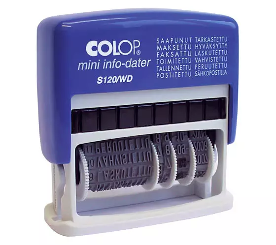 Itsevärjäytyvä automaattileimasin. Kirjasinkorkeus 4 mm. 12 suomenkielistä otsikkoa ja säädettävä päiväys. Sini-punaleimaus- jälki (otsikko sininen/päiväys punainen) Päiväys vuoteen 2029 asti. Laitteen mitat 3,3 x 7 x 8 cm. Varatyyny E/12/2 sini-punainen