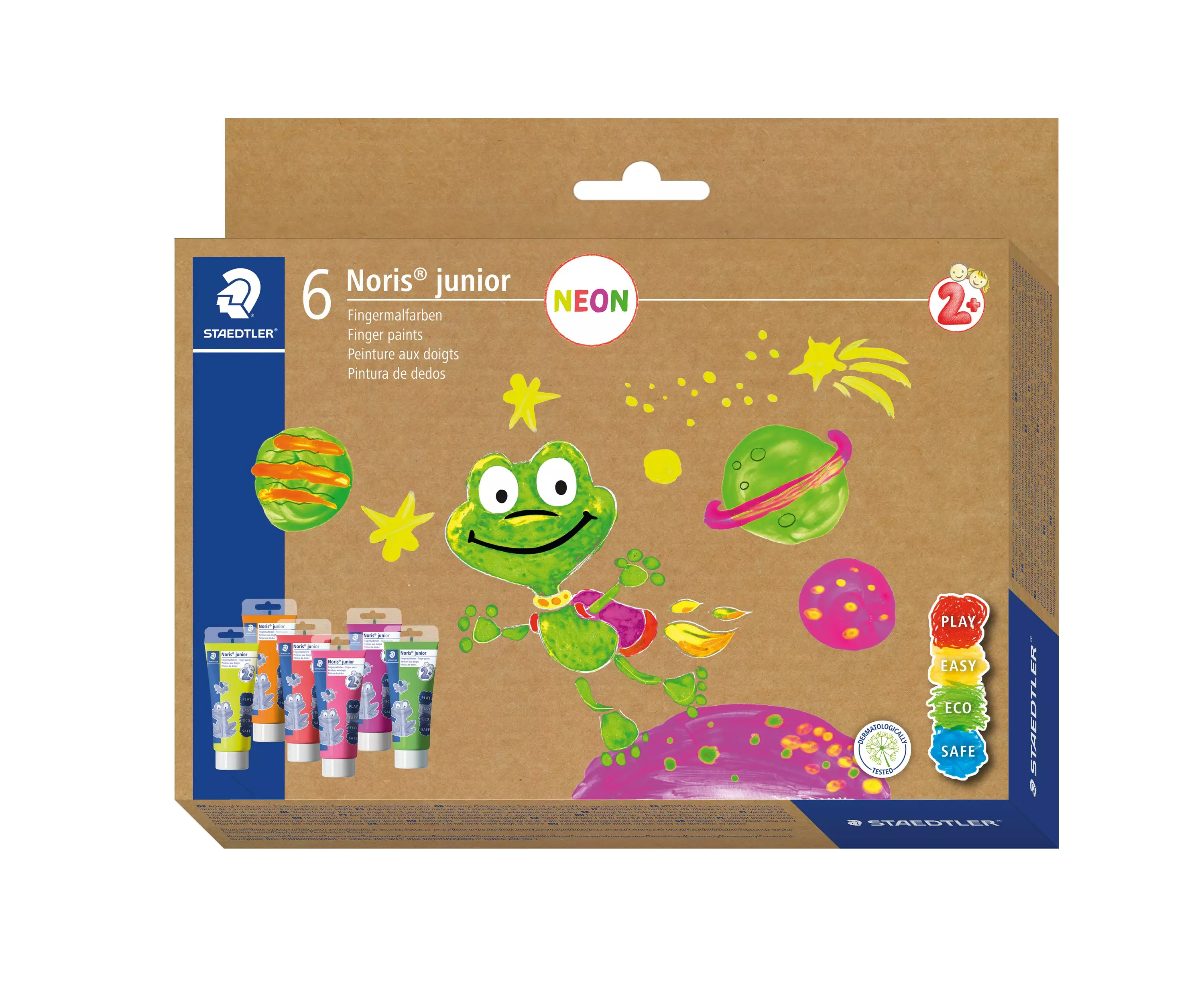 Noris® Junior -sormiväri. Tuote, jolla on korkea opetusarvo. Eloisat, valonkestävät värit. Voidaan levittää paperille, pahville, villalle ja lasille/ikkunoille sormilla, sienellä, lastalla tai siveltimellä. Hyvä tarttuvuus ikkunoihin. Helppo häivyttää. Nopeasti kuivuva. Vastaa standardia EN71, osa 7. Pahvi on valmistettu vähintään 80 % kierrätysmateriaalista. Sisältö: 6 x sekalainen neonväri
