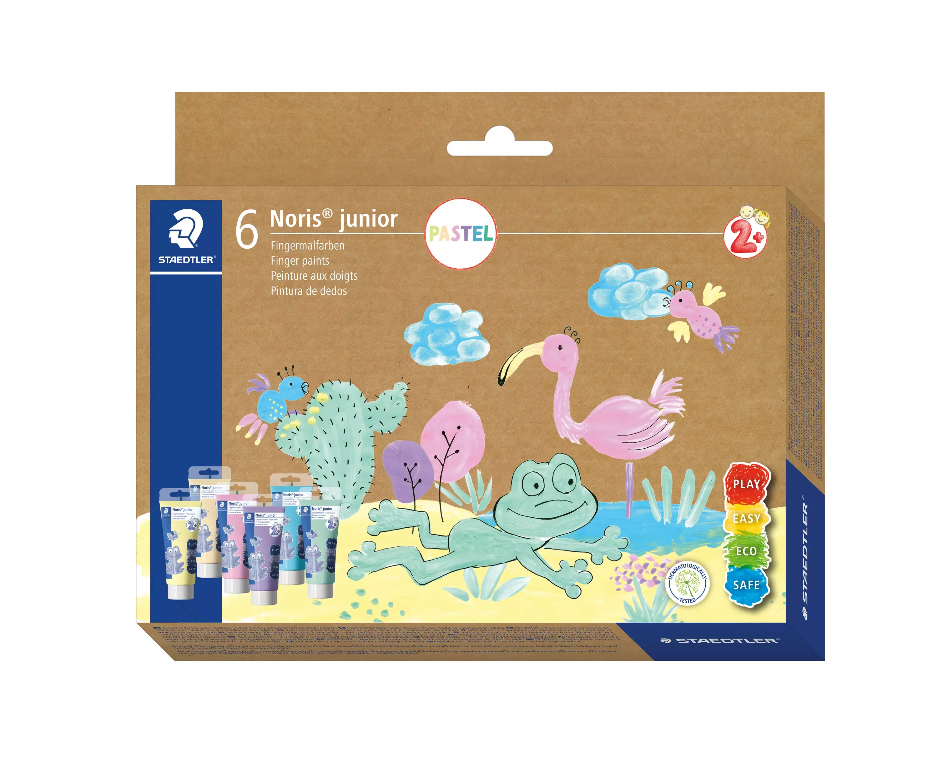 Noris® Junior -sormiväri. Tuote, jolla on korkea opetusarvo. Eloisat, valonkestävät värit. Voidaan levittää paperille, pahville, villalle ja lasille/ikkunoille sormilla, sienellä, lastalla tai siveltimellä. Hyvä tarttuvuus ikkunoihin. Helppo häivyttää. Nopeasti kuivuva. Vastaa standardia EN71, osa 7. Pahvi on valmistettu vähintään 80 % kierrätysmateriaalista. Sisältö: 6 x erilaisia ??pastellivärejä