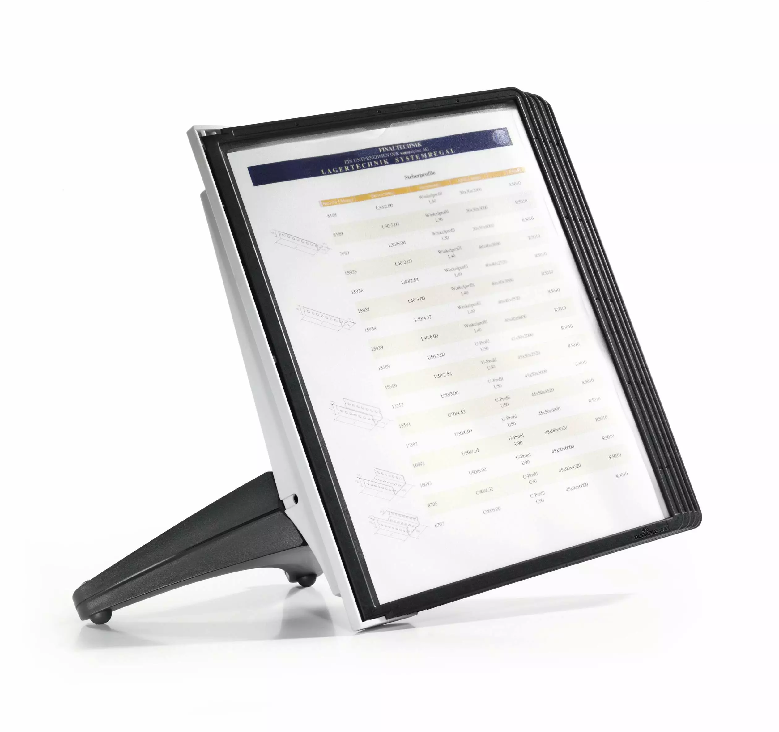 Durable Sherpa Soho 5540 on käyttövälmis ja tilaa säästävä pöydällä pidettävä selailuteline. Telineessä on 5 kpl tukevaa, heijastamatonta pikahakutaskua. Taskujen reunat on vahvistettu mustalla reunuksella.Koko A4.