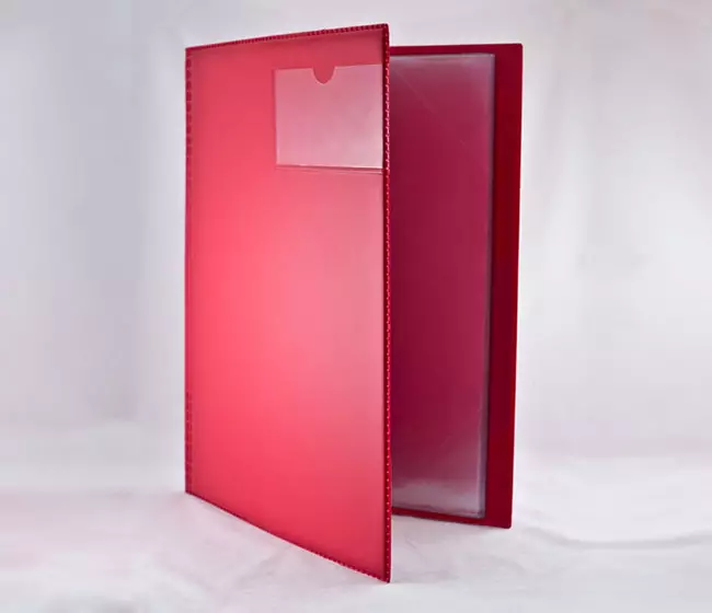 Potilaskansio A4, 10-osainen. Etukannen oikeassa yläkulmassa tasku. Takakannen sisäpuolella vinotasku. Kulmat etukannen sisäpuolella, kulmallinen etulehti. PVC-muovia. Punainen.