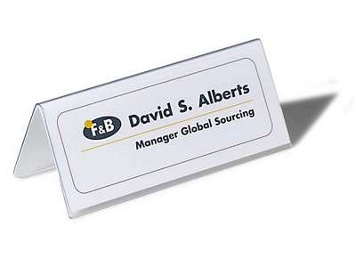 Pöytäkilpi 8050 Durable 61/122x150mm Tukevaa PVC-muovia. Luettavissa molemmilta puolilta. Mukana vaihdettavat kartonkiset kortit, joissa reunakoriste.