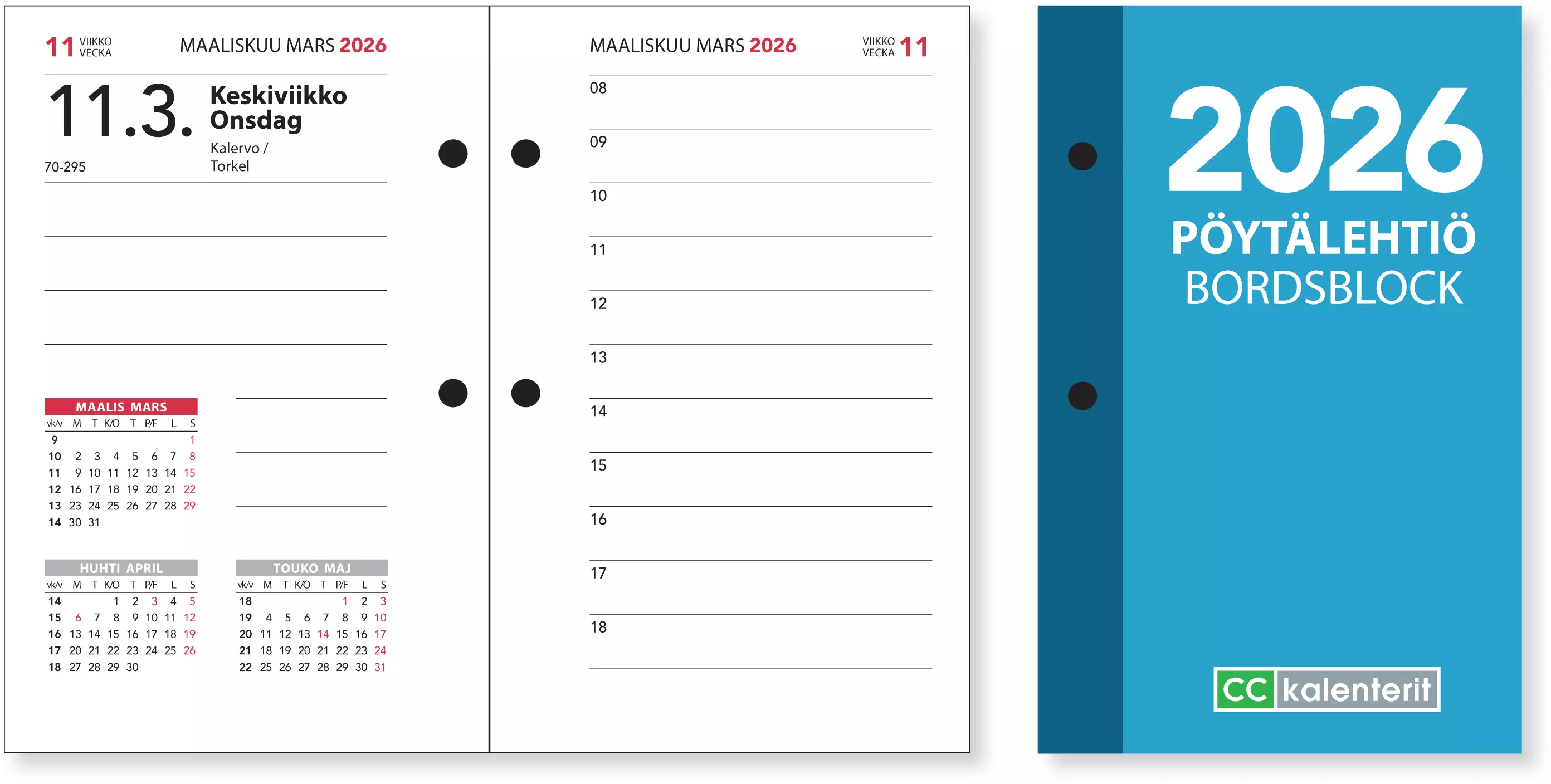 Perinteinen toimistokalenteri. Koko 75 x 115 mm, irtolehdet, vuosi 2026. Päivä aukeamalla, lauantait ja sunnuntait omina sivuinaan, tunnit 8-18. Liputuspäivät, kansalliset pyhät sivuilla, nimipäivät, kuukausitaulukot. Kaksireikäinen, sopii myös muiden valmistajien kaksireikäisiin alustoihin. Kieliasu suomi ja ruotsi.