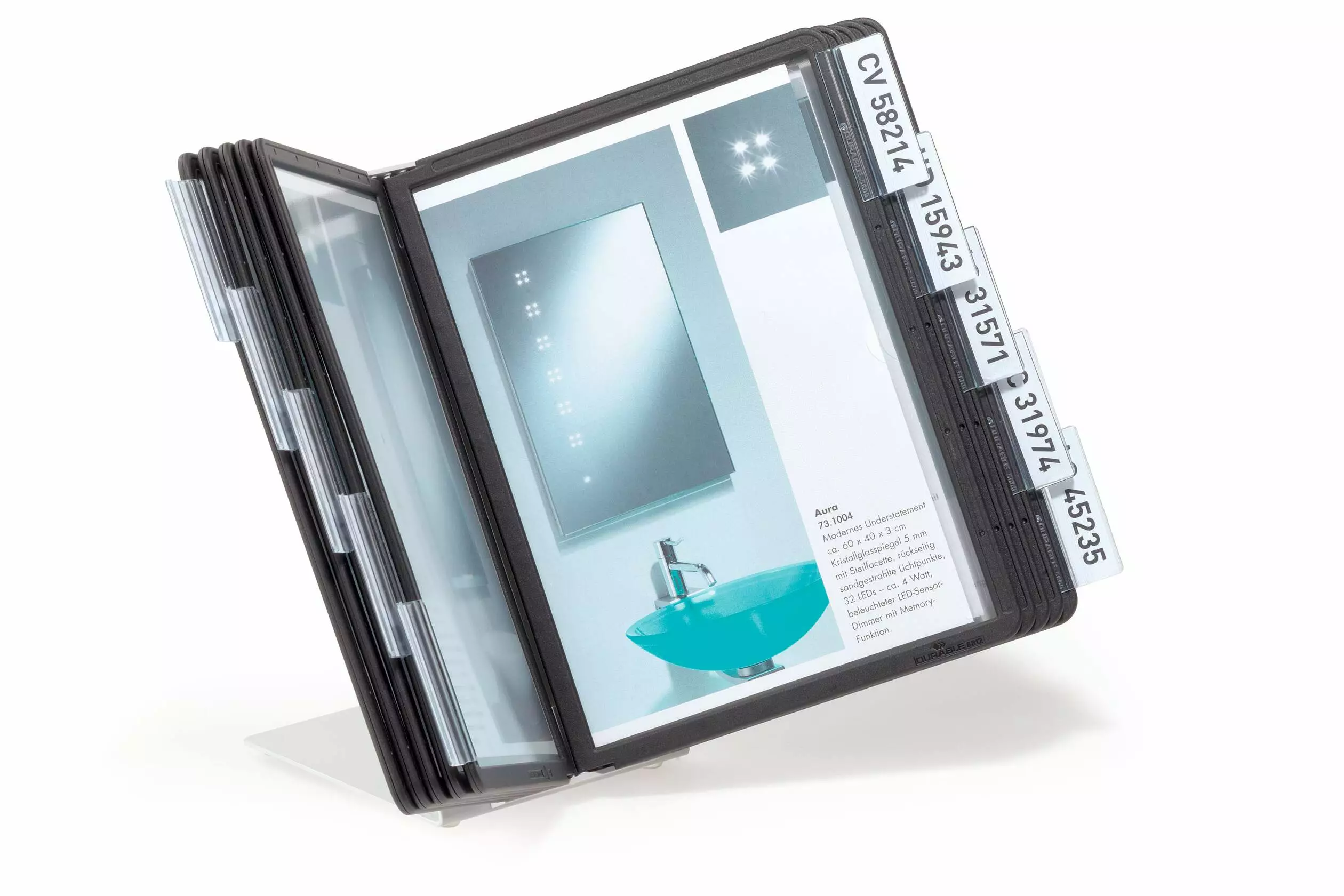 Durable Vario 5506 on pöydällä pidettävä, käyttövalmis selailuteline, jossa 10 kpl A5-kokoista pikahakutaskua. Taskujen reunat on vahvistettu mustalla reunuksella ja mukana tulee myös etiketit ja kielekkeet.