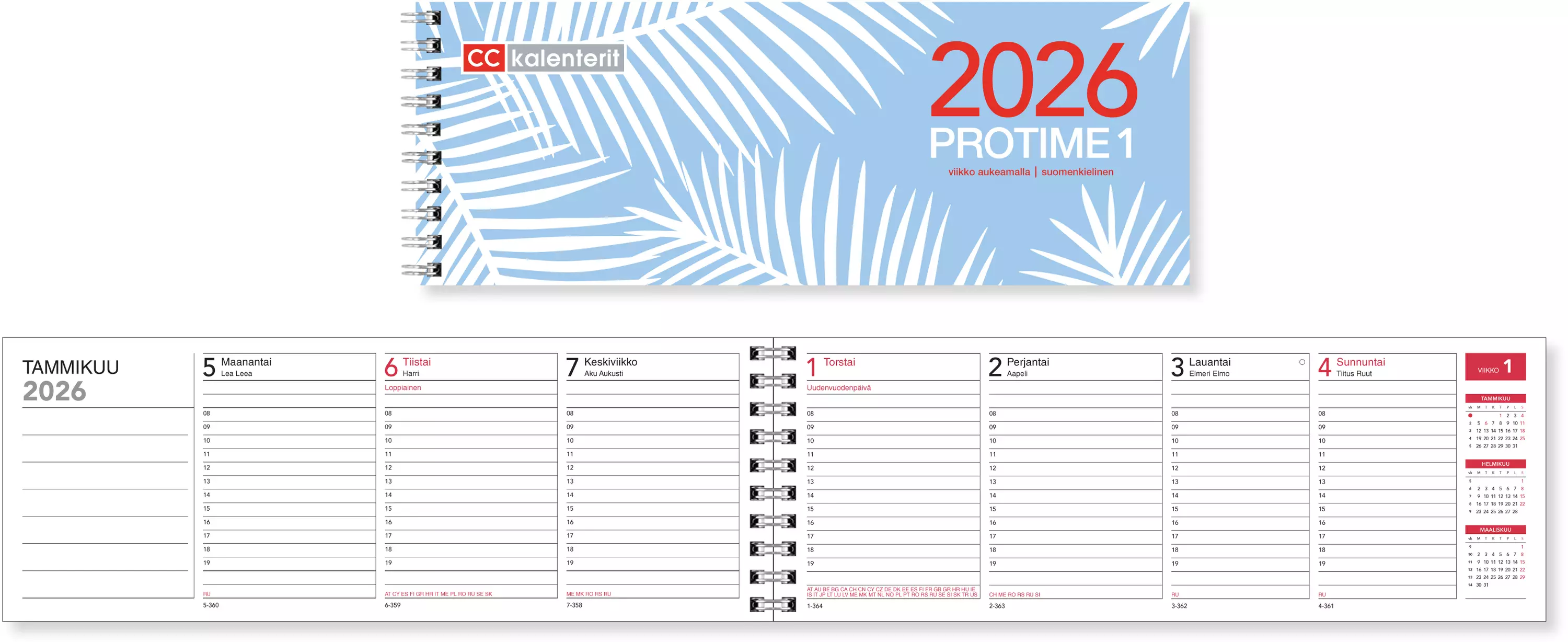 Koko 255 x 95 mm, viikot 50/2025-1/2027, vuosisuunnittelut 2026 ja 2027, vuosikalenterit 2027-2030. Viikko aukeamalla, tunnit 8-19 (myös viikonloppuna), liputuspäivät, kansalliset pyhät aukeamilla ja luettelona, nimipäivät, muistiinpanosivuja. Kartonkikannet, wiresidottu. Suomenkielinen.