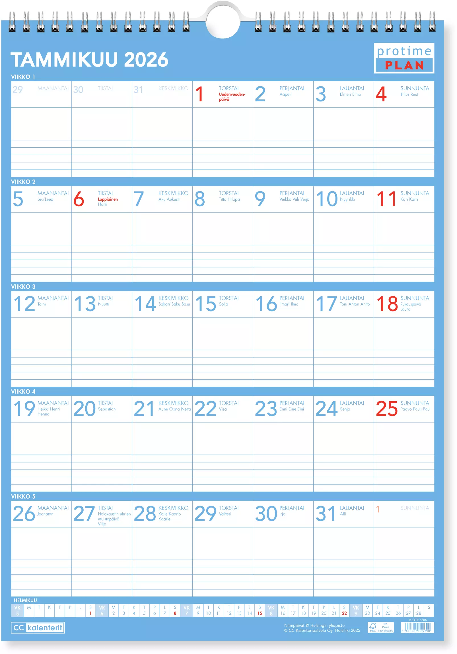 Koko 300 x 420 mm, 12 kuukautta, liputuspäivät, nimipäivät. Kukin kuukausi omalla sivullaan, alalaidassa myös seuraavan kuukauden seuranta. Päiväkohtaista kirjoitustilaa kokouksille, projekteille tai muille oleellisille asioille. Wiresidottu, ripustuslenkki. Suomenkielinen.