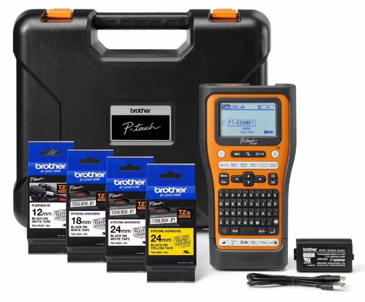Brother PT-E560BTSP - Pro-etikettikone korvaa PT-E550WSP • Suuri taustavalaistu graafinen näyttö • Tulostaa kestäviä, jopa 24 mm leveitä tarroja • Nopea tulostusnopeus jopa 30 mm/s ja automaattinen (täysi ja puolikas) leikkuri helpolla kuorintatoiminnolla useiden tarrojen tulostamiseen yhdelle jatkuvalle nauhalle • 6x yhden kosketuksen sovellusnäppäintä yleisen, etulevyn, kaapelilipun/kääreen, rei'ityslohkon ja paikkapaneelin tunnistamiseen • Tulosta QR-koodia/2D-viivakoodia ja logoja sisältäviä tarroja Samat tiedot kuin PT-E560BTVP, mutta mukana tulee 4 nauhaa laatikossa: Sisältää: kantolaukun, ladattava Li-ion-akku, USB-A-USB-C-kaapeli (1 m, musta), 1x 18 mm mustavalkoinen vahva teippi, 1x 24 mm musta valkoisella vahva teippi, 1x 24 mm musta keltaisella vahva teippi, 1x 12mm mustavalkoinen joustava ID-teippi Virtalähde ei sisälly toimitukseen. Lataa USB-C-portin kautta. USB-C-laturi vaatii USB-C-USB-C-kaapelin.