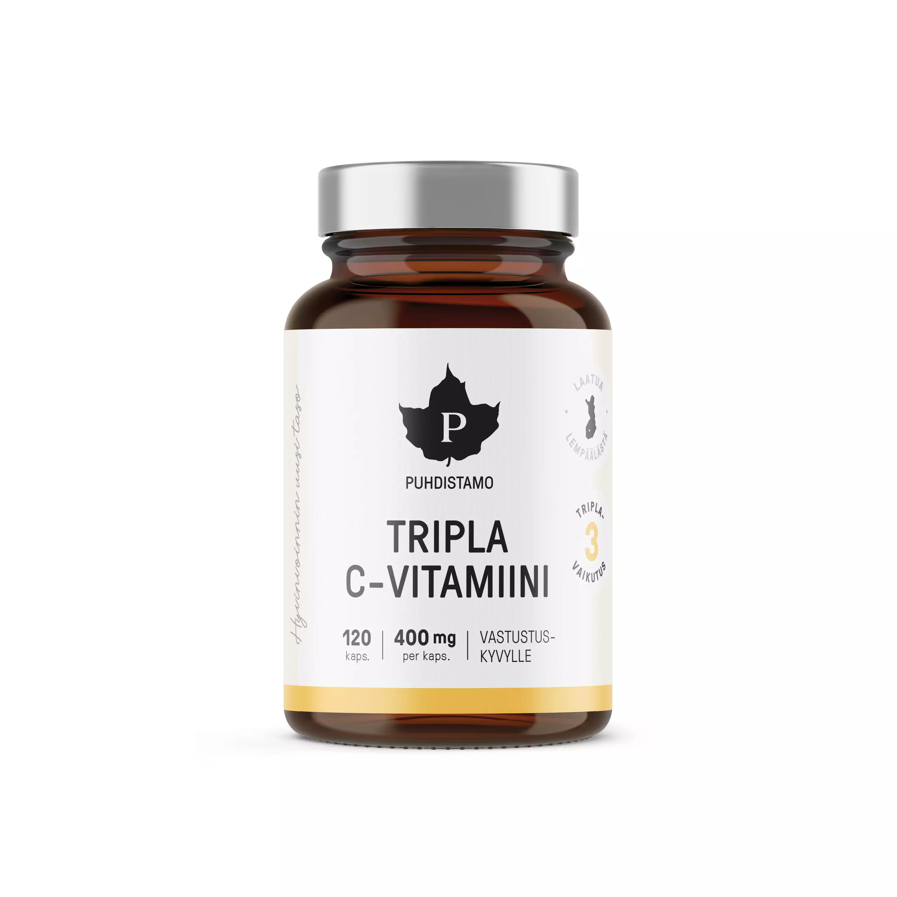 Puhdistamon Tripla C-vitamiini yhdistää kolme tehokasta C-vitamiinin muotoa yhdessä Camu camu -marjajauheen ja sitrusbioflavonoidien kanssa. Etelä-Amerikan sademetsissä kasvavaa Camu camu -marjaa pidetään C-vitamiinipitoisimpana marjana. Camu camu -marjan sisältämät bioaktiiviset aineet vähentävät hapettumisstressiä elimistössä, kun taas sitrusbioflavonoidit suojaavat C-vitamiinia hapettumiselta. Näin ainesosat takaavat C-vitamiinin parhaan mahdollisen imeytymisen.
