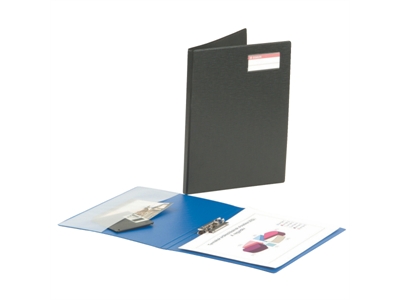 Valmistettu kartongista, joka on päällystetty muovilla. Etukannessa kirkas etikettitasku. Sisäkannessa leveä, kirkas pystytasku. Selän leveys 14 mm.
