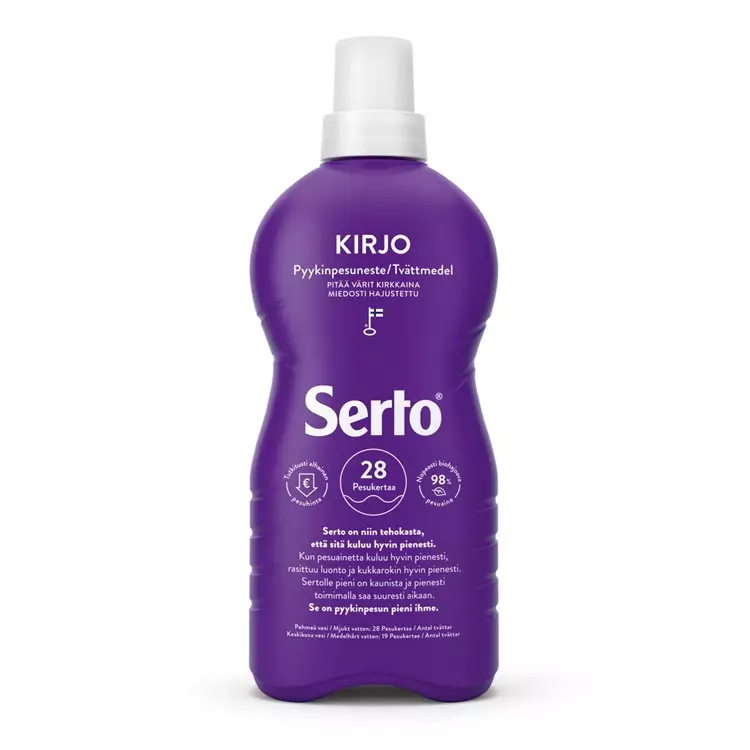 Pitää värit kirkkaina ja puhdistaa tehokkaasti. Serto Kirjo pyykinpesuneste on suunniteltu erityisesti värillisen pyykin pesuun ja saavuttaa ihanteellisen pesutuloksen jo alhaisissa pesulämpötiloissa. Pyykinpesunesteen värisuoja suojaa tekstiilien värejä pesussa ja pitää ne kirkkaina. Miedosti hajustettu. Ei sovellu villalle ja silkille.