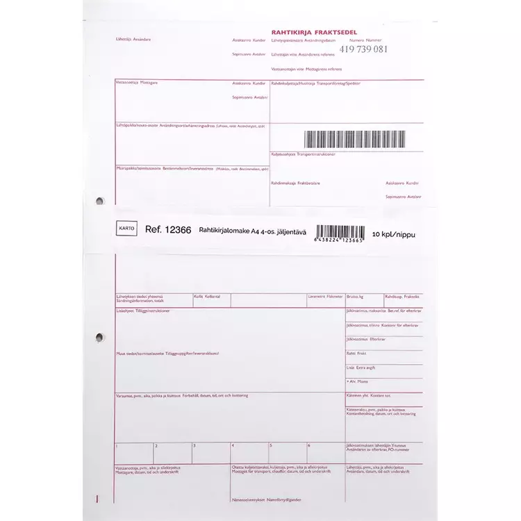 Neliosainen rahtikirjalomake käsinkirjoitukseen. Juoksevalla numerosarjalla. Jatkolomake. Rei'itys 8 cm. Avainlipputuote. 10 kpl/pkt.