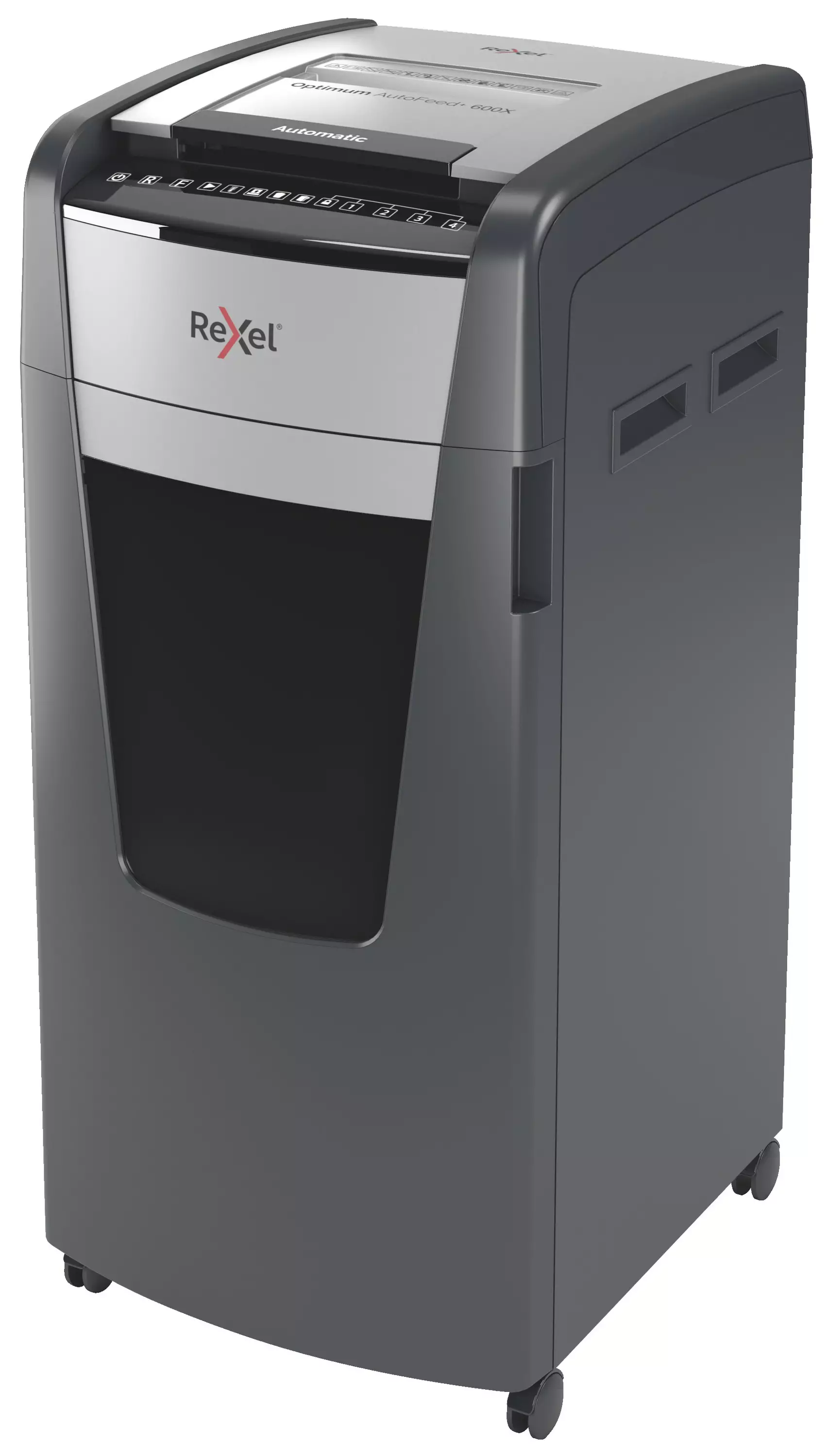 Optimum AutoFeed 600X paperintuhooja silppuaa maksimissaan 600 arkkia (80gsm) kerrallaan P-4 (4x36 mm) ristiinleikattua silppua. 110 litran ulosvedettävä säiliö tekee tästä tuhoojasta täydellisen toimiston käyttöön. Ei manuaalista paperinsyöttöä tai niittien ja paperiliittimien poistamista, tämä automaattinen paperintuhooja tekee kaiken työn puolestasi. - Automaattinen arkkisyöttö maksimissaan 600 arkkia (80gsm). Käsisyöttö maksimissaan 15 arkkia. - P4 ristiinleikattu silppu (4x36mm) - 110 litran suurikapasiteettinen silppusäiliö. Muovinen silppuripussin annostelija oven sisäpuolella auttaa pussin vaihtamista. - Pyörien avulla helppo siirtää. - Älykäs jumiutumisen poistaja - Luottokortit, niitit ja paperiliittimet - 240 minuutin jatkuva käyttöaika. Lepotila aktivoituu 3 minuutin käyttämättömyyden jälkeen. -Kosketusnäyttöohjain PIN-koodilla - Äänen voimakkuus 55 dBA - Infrapuna-varoitus säiliön täyttyessä - 2 vuoden takuu, 2 vuoden leikkuritakuu