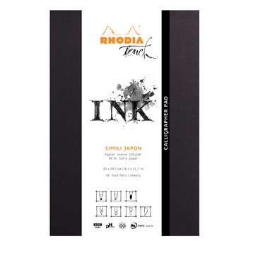 Rhodia Calligrapher alusta A4+ 50sh blank 130g 130 gsm luonnollinen simili japan paperi liimattu yläosaan, kangastaustainen pehmuste Maya musta 126 lb kortin kansi Rhodia touch logo kohokuvioitu etukannessa 50 irrotettavaa mikrorei'itettyä arkkia tyhjä paperi musta A4 (21x29,7 cm) tyhjä paperi