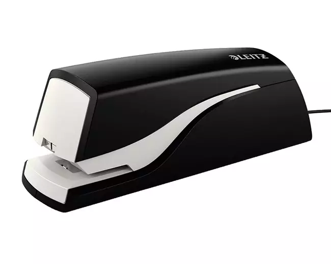 Elektroninen nitoja. Nidontakapasiteetti 10 arkkia. Nidontasyvyys 10 mm. Toimii verkkovirralla. Mitat: 49 x 56 x 155 mm. Niitit Leitz e1. Väri: musta. Takuu 3 vuotta.