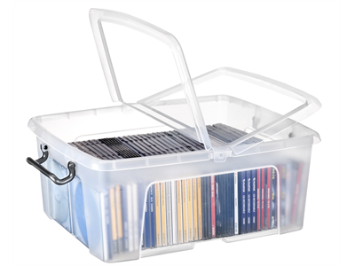 Säilytyslaatikko Strata kannella 24l läpinäkyvä on monikäyttöinen säilytyslaatikko asiakirjoille tai tarvikkeille. Molemmista päädyistä lukittava avattava kansi. Syvään uurrettu kansi mahdollistaa helpon kuljetuksen pinottuna. Varastoitaessa laatikot on mahdollista pinota sisäkkäin. Kantokahvat. Materiaali 100% kierrätettävää polypropeenia. Soveltuu myös elintarvikkeiden kanssa käytettäväksi. Saatavana muita kokoja. Mitat: 500 x 395 x 202 mm