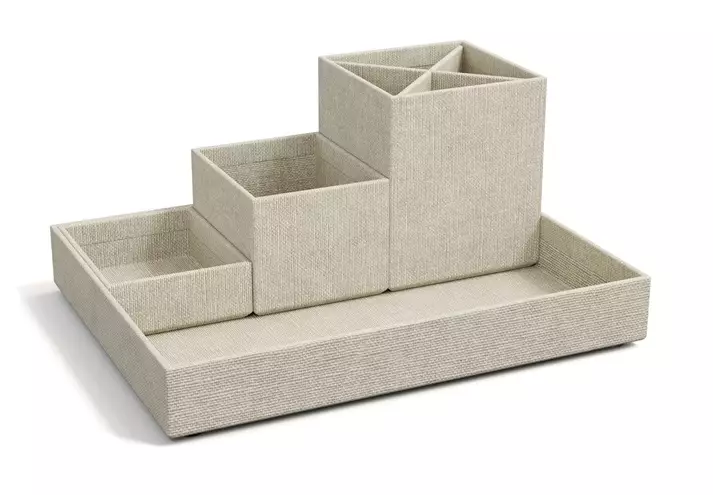 Bigso Lena on kohokuvioinen, kierrätyspahvista valmistettu ja paperilaminoitu säilytysrasiasetti pienten tavaroiden järjestämiseen. Rasiat voidaan asetella vierekkäin tai käyttää erikseen. Tuote on valmistettu vähintään 80-prosenttisesti kierrätysmateriaalista ja sillä on FSC Mix -sertifikaatti. Mitat: 235 x 180 x 110 mm. Väri: C55 pellava.