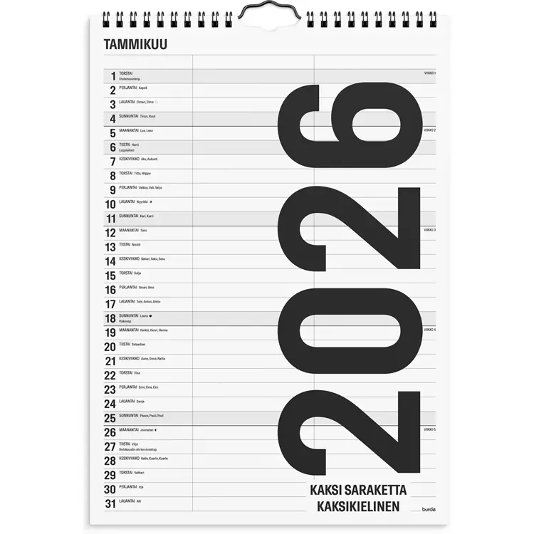 Burden Seinäkalenteri Black & White on pienemmälle perheelle tai pariskunnalle sopiva seinäkalenteri vuodelle 2026. Jokaisella aukeamalla on yksi kuukausi ja kaksi saraketta perheen menojen suunnitteluun. Kalenteri sisältää liputuspäivät, juhlapyhät ja kuun vaiheet.