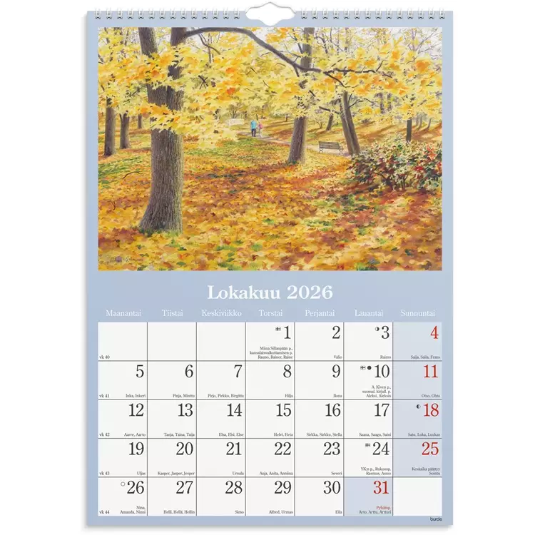 Burden Klassinen Suomi -seinäkalenteri vuodelle 2026 on täynnä kuvittaja Niklas Johanssonin piirtämiä kauniita maisemakuvia Suomesta. Kalenteri sisältää nimipäivät, liputuspäivät, juhlapyhät ja kuun vaiheet.