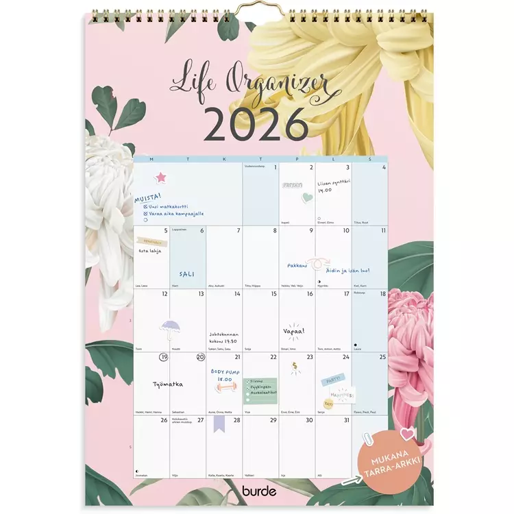Burden Life Organizer on A3-kokoinen seinäkalenteri vuodelle 2026, jossa on paljon tilaa arjen organisointiin. Tyylikkäästi pastellivärein koristellun kalenterin aukeamalla on kuluvan kuukauden lisäksi tilaa muistiinpanoille, ja mukana tulee myös tarra-arkki koristeluun. Kalenteri sisältää nimipäivät, liputuspäivät, kansalliset pyhäpäivät ja kuun vaiheet.