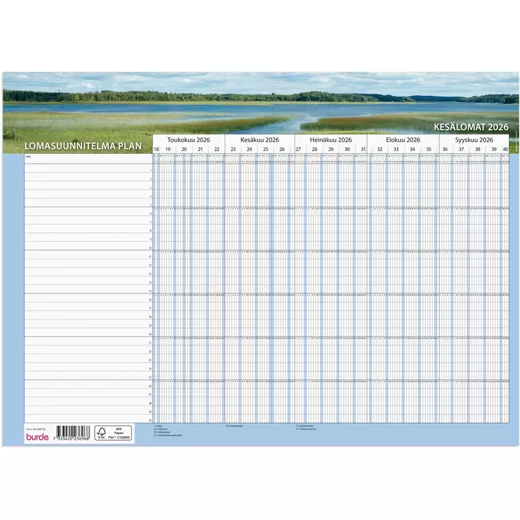 Burden Lomasuunnitelma Plan on kaksipuolinen lomasuunnittelukalenteri, jonka toisella puolella on kesälomakuukaudet toukokuusta syyskuuhun 2026 ja toisella talvilomakuukaudet lokakuusta huhtikuuhun 2026-2027. Kalenteri sisältää valittuja kirkkopyhiä ja juhlapyhiä. Tuote on valmistettu FSC-sertifioidusta materiaalista. Mitat: avattuna 405 x 297 mm, taitettuna A4 Kielet: suomi