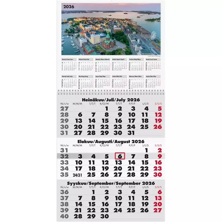Burden Triplaner -seinäkalenterin vuodelle 2026 jokaisella sivulla on kolmen kuukauden kalendaario. Kuluva kuukausi on keskellä ja yläreunasta löytyvät koko vuoden kuukausitaulukot. Kalenterissa on ripustusreikä ja siirreltävä päiväosoitin. Tuote on valmistettu FSC-sertifioidusta materiaalista. Mitat: 285 x 615 mm Kielet: suomi/ruotsi/englanti Parikierresidottu