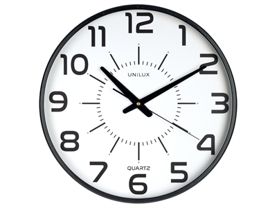 Hiljaisessa Unilux Maxi Pop seinäkellossa on mukana tulevilla paristoilla (1 x AA 1,5 V) toimiva Quartz-koneisto. Selkeät ja isot mustat numerot valkoisella taustalla ovat helposti luettavissa 150 m etäisyydeltä. Kellon ulkokuori on muovia ja kellon edusta on lasia.