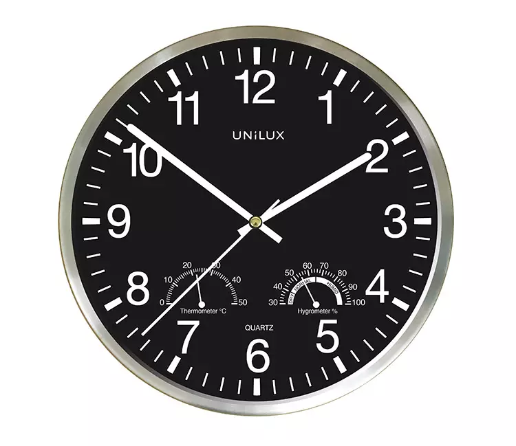 Musta kellotaulu valkoisilla osoittimilla. Halkaisija 30 cm, luettavissa 35 m päästä. Sisätilan lämpömittari sekä kosteusmittari. Teräs kehys, etukansi mineraalilasia. Toimii yhdellä 1,5 V:n (AA) paristolla, joka sis. pakkaukseen. Paksuus 4,5 cm. Takuu 2 vuotta. Lisätietoja seloste-välilehdellä.
