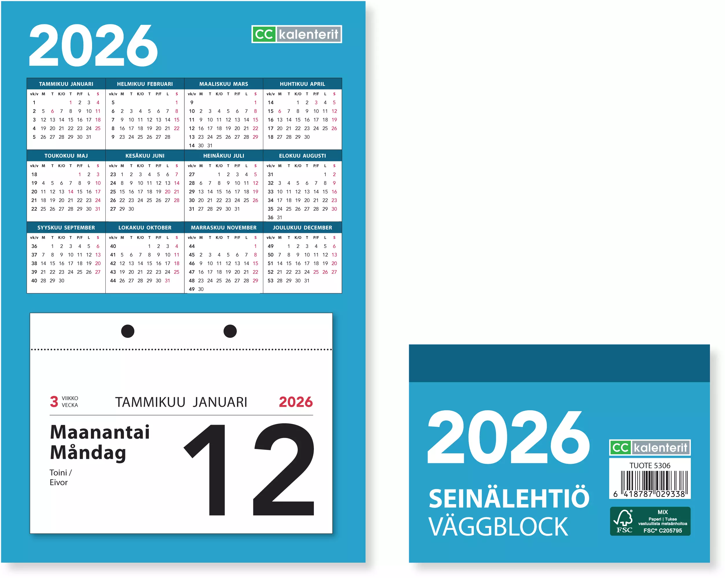 Lehtiön koko 77 x 110 mm, taustakartongilla 130 x 200 mm, vuodenpäivät kukin omalla helposti sivusuunnassa irrotettavalla sivullaan. Kalenteri on kiinnitetty tukevaan ripustustaustaan metallikiinnikkein. Päiväkohtaista muistiinpanotilaa. Pahvisessa ripustustaustassa on koko kalenterivuosi taulukkona. Kieliasu suomi ja ruotsi.