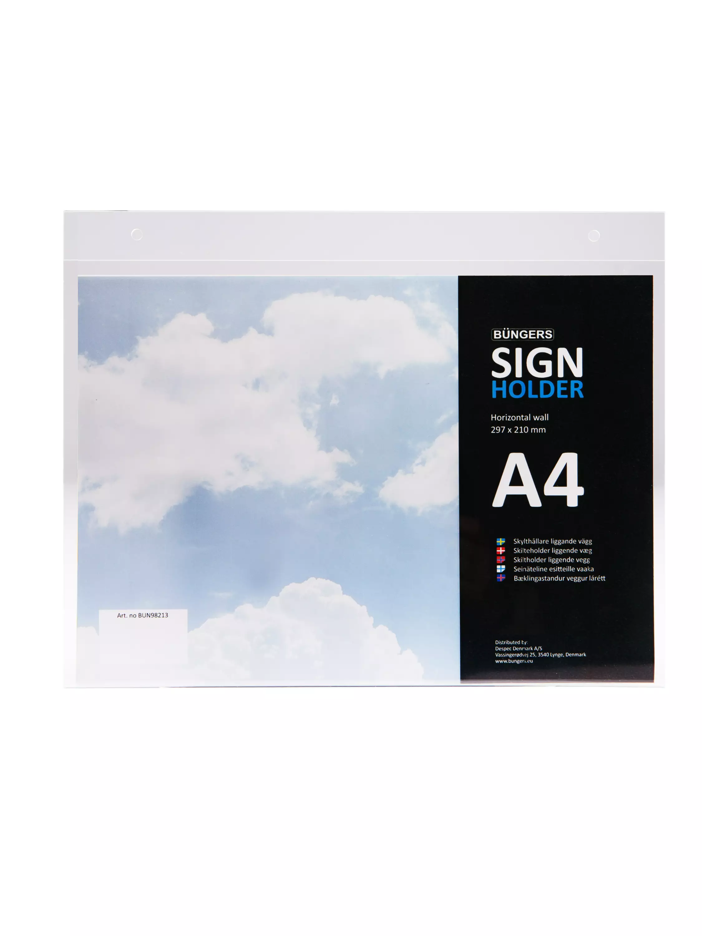 Kirkkaasta polystyreenistä valmistetut kylttitelineet seinäasennusta varten.