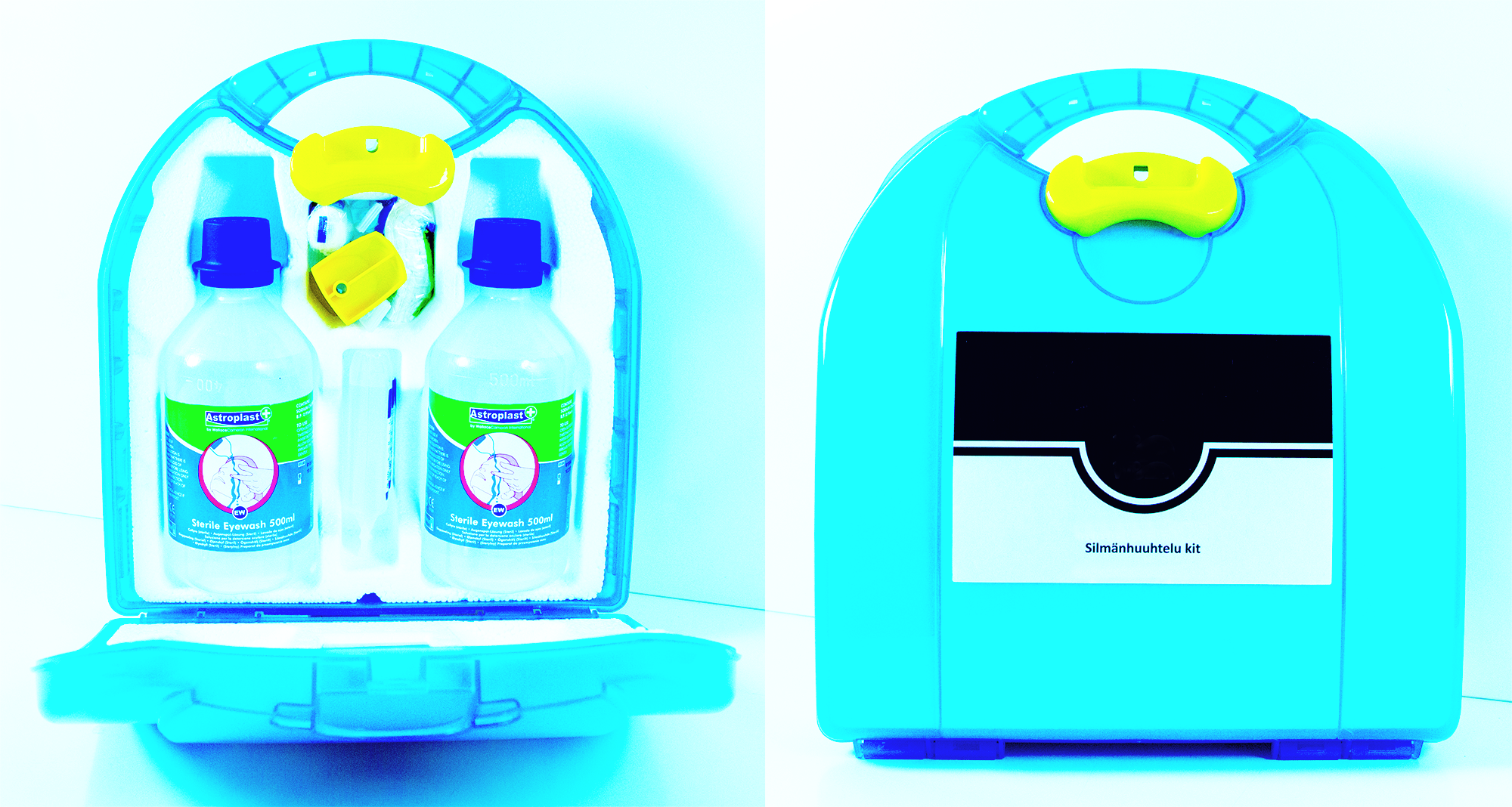 -kiinteä plus siirrettävä -sisältää kolmea eri kokoa huuhdetta -kestää pakkasta noin -5 astetta -sisältää myös steriilit silmänpeittoliinat