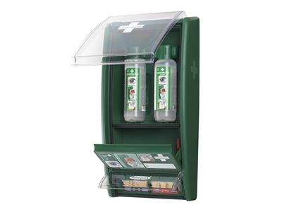 Silmänhuuhteluasema CederrothUudistetussa Cederroth silmänhuuhteluasemassa on tilaa kahdelle 500 ml:n silmänhuuhtelupullolle (sisältyvät asemaan). Läpinäkyvä kansi ja kumilistat suojaavat pulloja pölyltä ja roiskeilta.Aseman alaosassa on laastariautomaatti (45 kpl muovilaastari ja 40 kpl kangaslaastari) ja tilaa täydennystuotteille esim. suojalaseille, ensiapusiteille jne. Mitat 56x29x12cm.