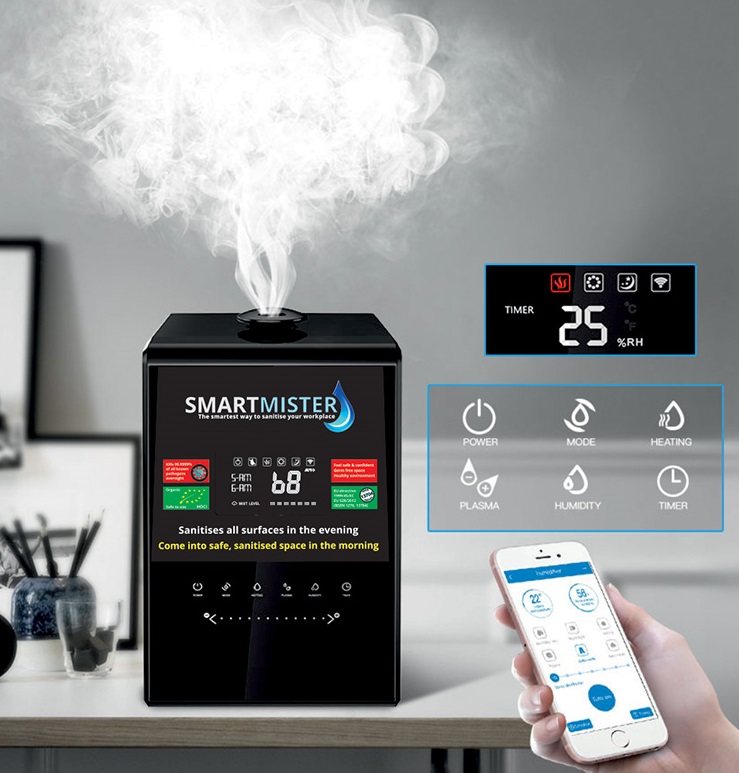 Smartmister ilmanpuhdistaja. Tämä automaattinen, työpaikoille tarkoitettu älyilmanpuhdistaja desinfioi ja raikastaa pinnat miellyttävästi höyryn avulla. Se on helppo käyttää ja täyttää; laitteessa on iso säiliö, joten yksi täyttö riittää jopa 31 päivän ajaksi. Erittäin tehokas myös Covid-19 vastaan. Puhdistaa ja raikastaa toimistoilman, sekä luo turvaa tuhoamalla ilmassa olevia tauteja aiheuttavia partikkeleja.