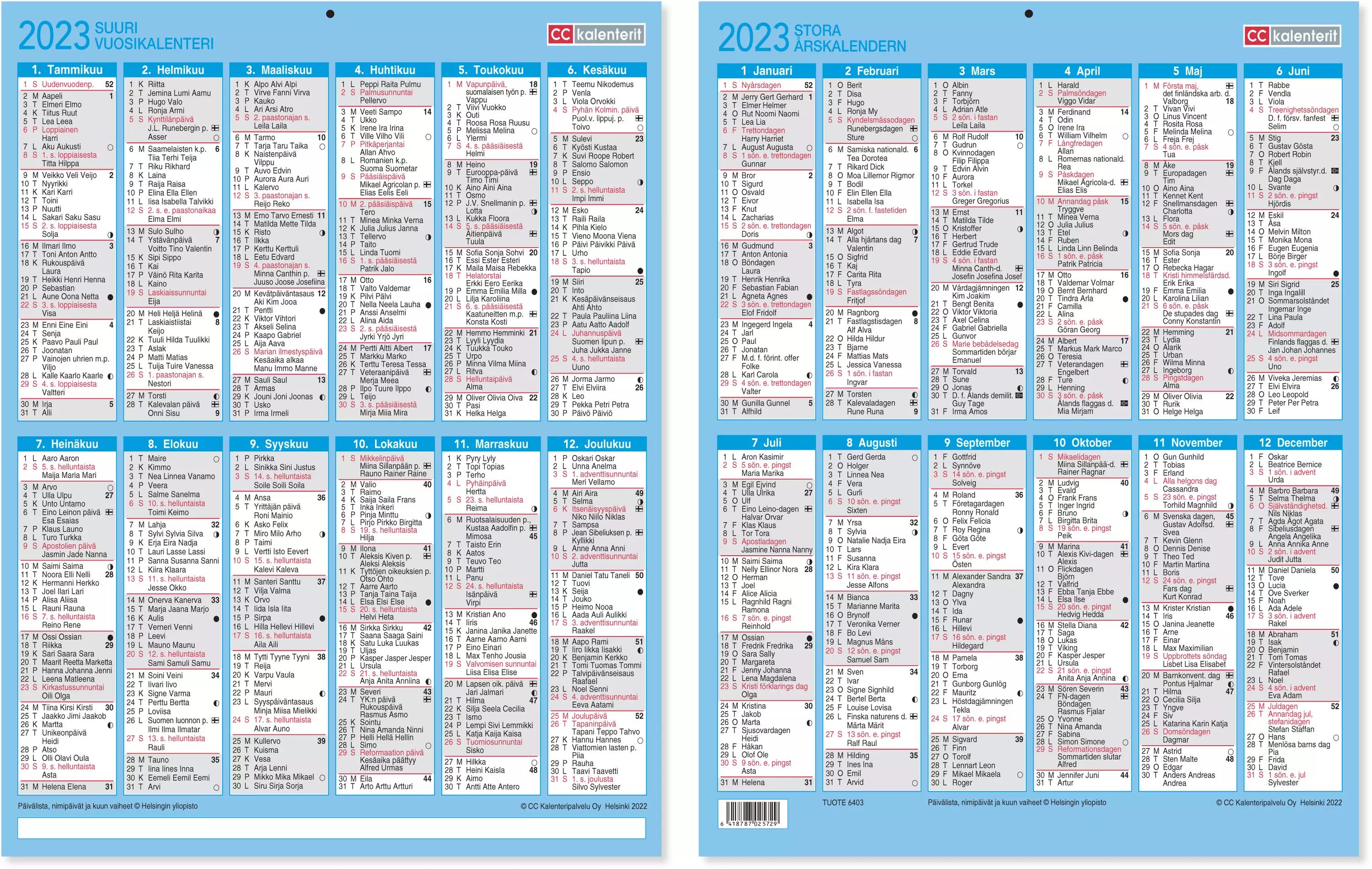 VUODEN 2023 KALENTERITOIMITUKSET ALKAVAT SYYSKUUSSA 2022! Koko 310 x 400 mm, helppolukuinen suomen- ja ruotsinkielinen taulukkokalenteri, jossa kumpikin kieli on omalla puolellaan. Liputuspäivät, kansalliset pyhät, nimipäivät, kuun vaiheet. Ripustusreikä, tukevaa mattakartonkia.