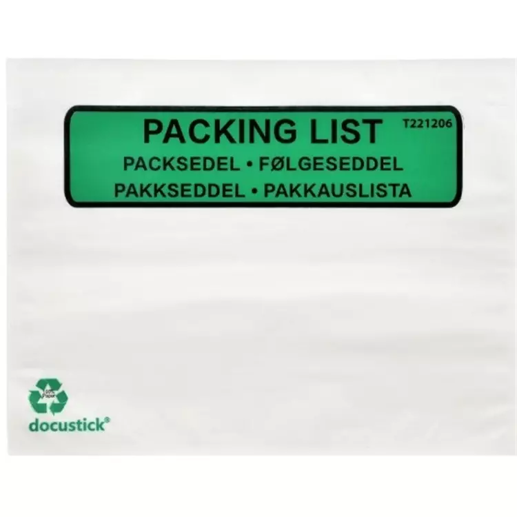 Täysin muoviton ja 100% kierrätettävä Docustick Green on ympäristön kannalta vastuullinen valinta lähetyslistojen suojaksi kaikkiin lähetyksiin, jotka eivät vaadi säänkestävyyttä. Vain paperista ja liimasta koostuva tasku kiinnittyy laatikon pintaan hyvin ja sallii lähetyslistan lukemisen helposti. Pakkauslista-teksti, pitkä sivu auk, 228x165mm, samea läpinäkyvä.