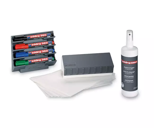 Välinesetti sisältää: 1 pullon valkotaulun puhdistusainetta, 1 taulupyyhin BMA 2, 1 valkotaulukynäteline magneetilla, 4 eriväristä valkotaulukynää(Edding 360)