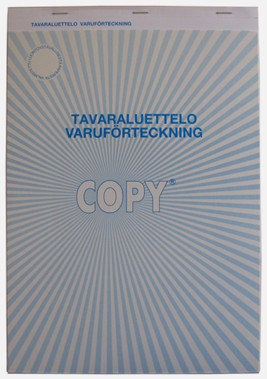 Tavaraluettelo inventointiin. Kirjoituspaperia 70g/m2, perforoitu, suomi/ruotsi.