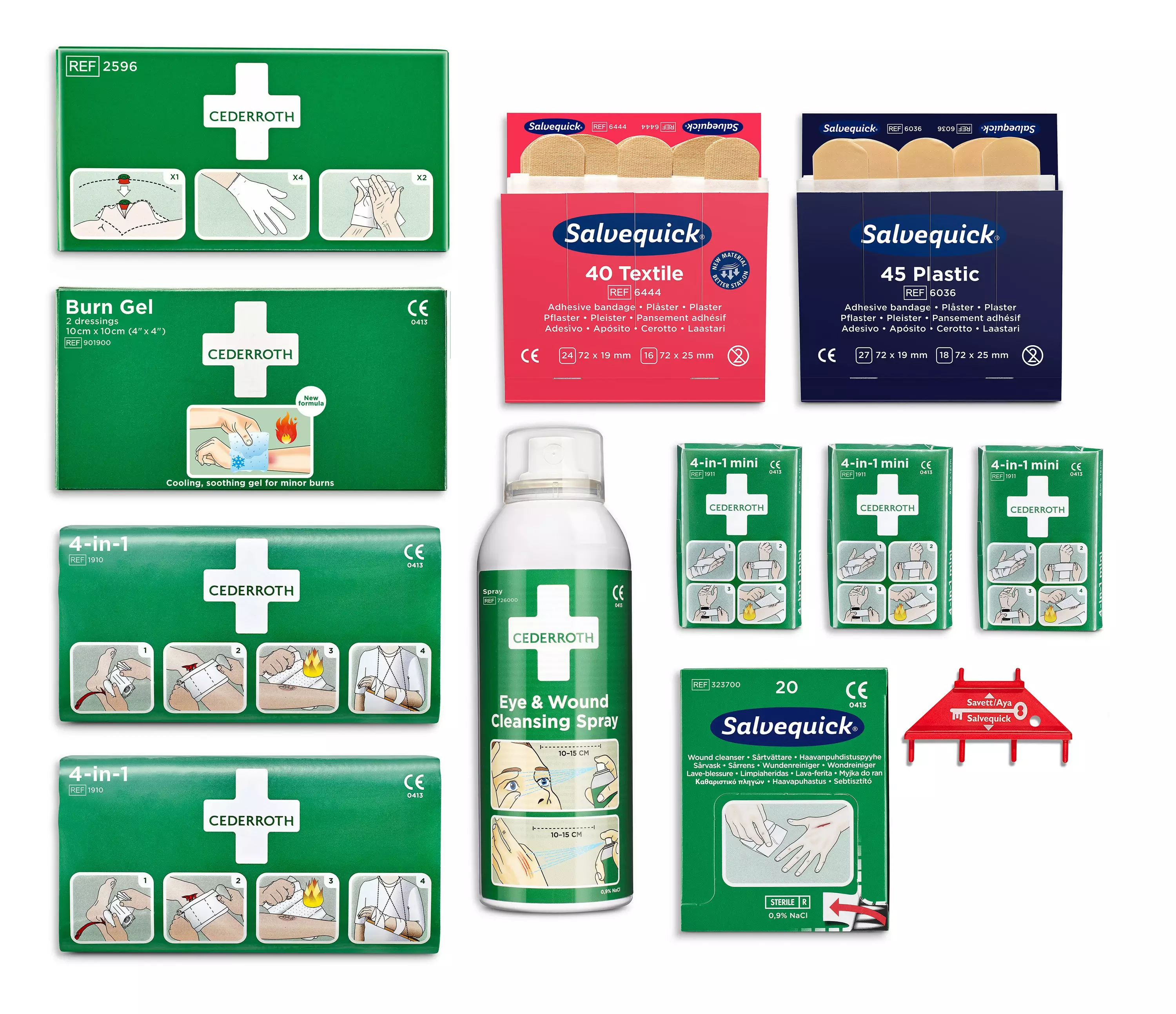 Cederroth täydennyspakkaus Ensiapuasemaan (REF 490920) sisältö on päivitetty Eye & Wound Cleansing Spray:llä sekä Burn Gel palovammataitoksella. 2 kpl Cederroth 4-in-1 iso ensiapuside, 3 kpl Cederroth 4-in-1 pieni ensiapuside, 1 kpl Cederroth tartuntasuojapakkaus, 1 pk (45 kpl) Salvequick Muovilaastari, 1 pk (40 kpl) Salvequick Kangaslaastari, 1 ras (20 kpl) Salvequick Haavapyyhe, 1 kpl Cederroth Eye & WOund Cleansing Spray 1 Cederroth Burn Gel Dresssing.