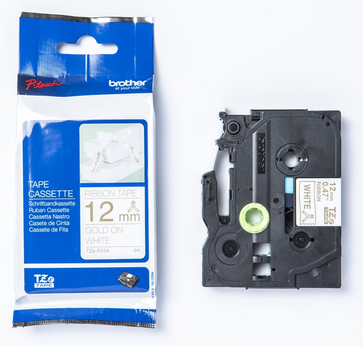 Tekstiilinauha Brother TZe-R234 12mm x 4m satiini valkoinen/kulta