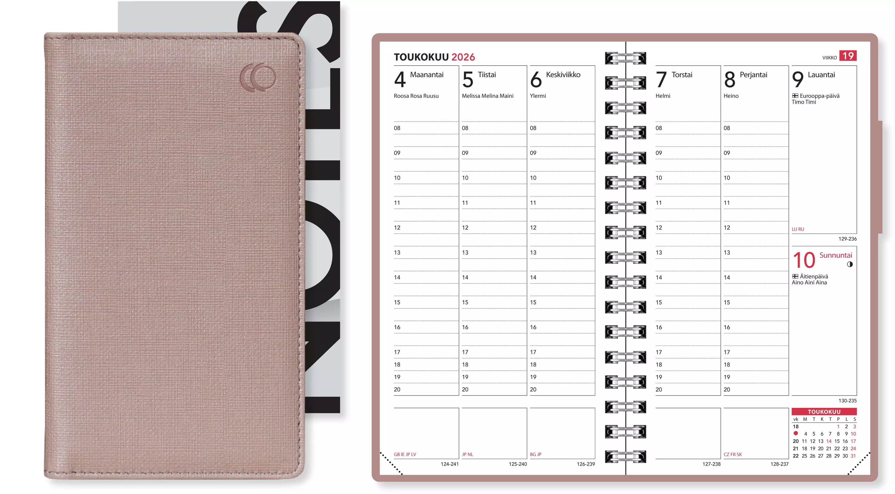 Selkeä ja tehokas Time-kalenteri tarjoaa runsaasti kirjoitustilaa. Pehmeissä laadukkaissa keinonahkakansissa on säilytystilaa vakkapa kuiteille. Koko 87 x 153 mm, viikot 50/2025-1/2027, vuosisuunnittelu 2026 ja laajennettu vuosi 2027, tehtäväluetteloita, infosivuja, muistiinpanosivuja. Aukeamalla viikko, tunnit 8-20, liputuspäivät, kansalliset pyhät aukeamilla ja luettelona, nimipäivät. Wiresidottu, kulmaperforoitu. Kynäholkki omalle kynälle. Suomenkielinen. Keinonahkakansissa on kalenterin lisäksi mukana myös siirrettävä Notes-muistio.